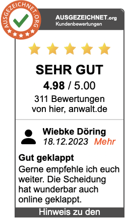 Im Scheidungstermin werden Sie dann von einem von uns beauftragten Scheidungsanwalt vor Ort vertreten. Natürlich entstehen für Sie dadurch keinerlei höhere Scheidungskosten.